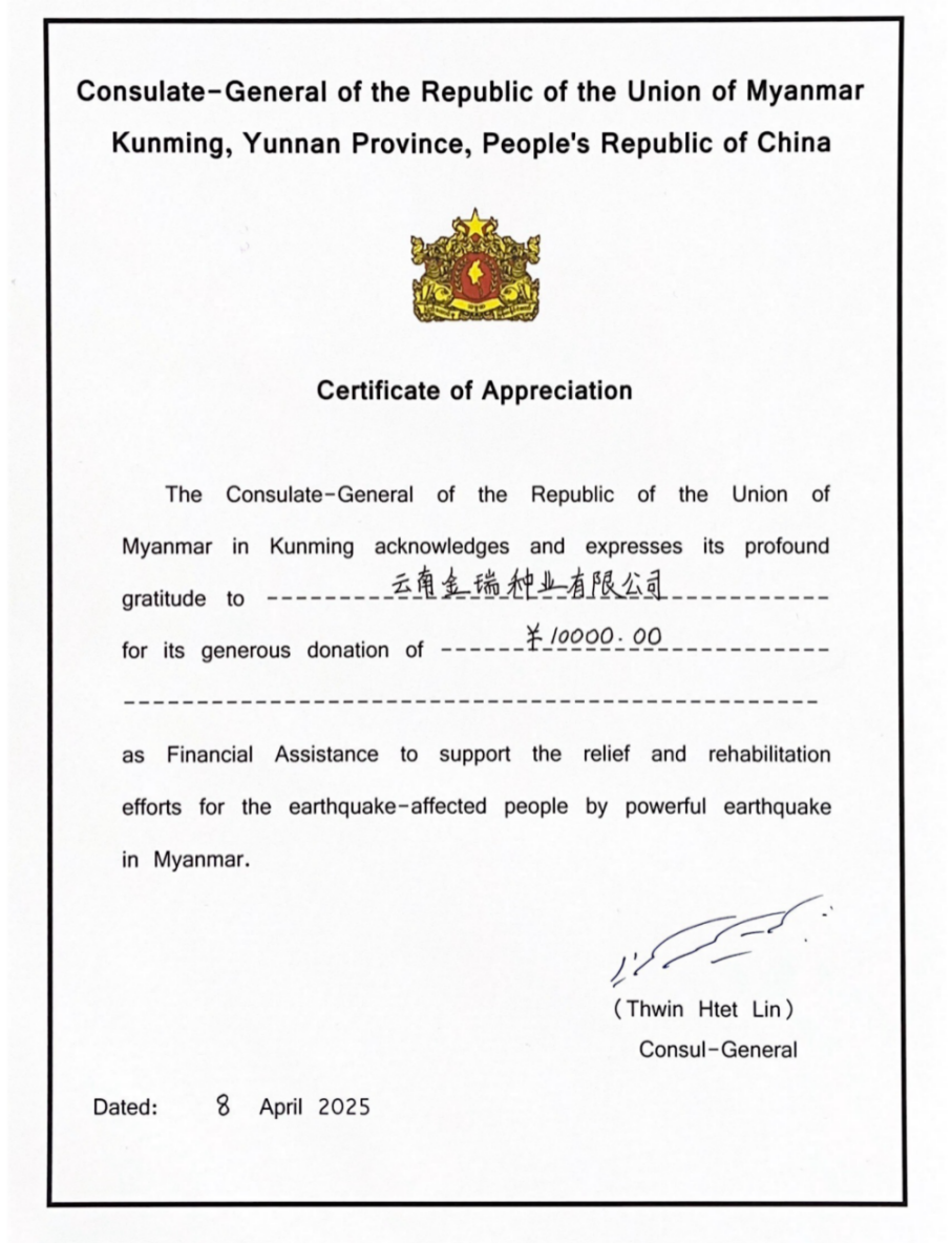 云南金瑞种业有限公司作为一家在缅甸从事替代种植的农业企业,长期致力于中缅农业合作与社会责任实践。得知缅甸中部地震灾情后,公司高度重视,迅速响应,积极履行企业社会责任,决定向灾区捐款人民币1万元整,用于支持灾区救援和重建工作,以帮助受灾群众尽快恢复正常生产生活。